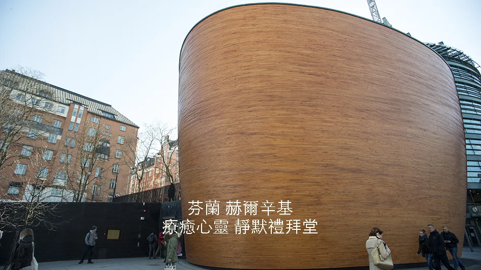 芬蘭(Finland)首都赫爾辛基(Helsinki)我最喜歡的一座建築,是在市中心的一座小禮拜堂Kamppi Chapel。這座教堂又名靜默禮拜堂Chapel of Silence,沒有任何崇拜活動,也不舉辦婚禮或舉行葬禮,只是靜靜地屹立在赫爾辛基鬧市之中,默默地迎接每一個需要一沉甸時刻的都市人。